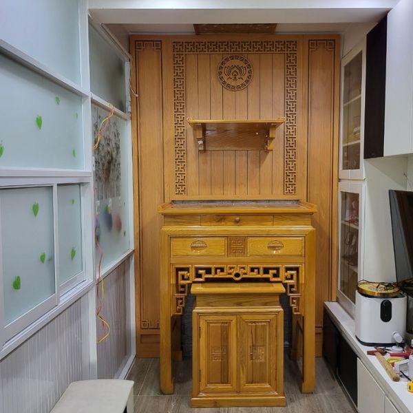 Vách ngăn được làm từ gỗ tự nhiên với những họa tiết phật giáo tinh xảo sẽ tạo nên một không gian phòng thờ linh thiêng và trang trọng.