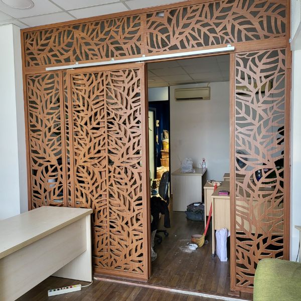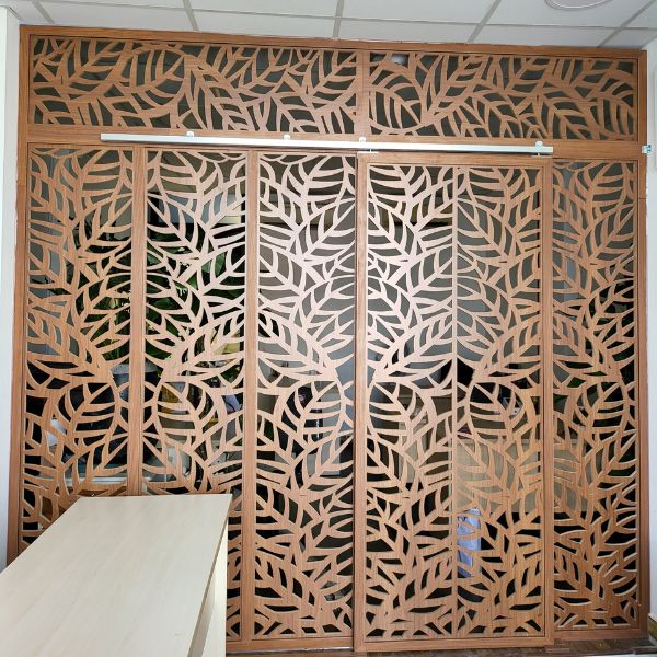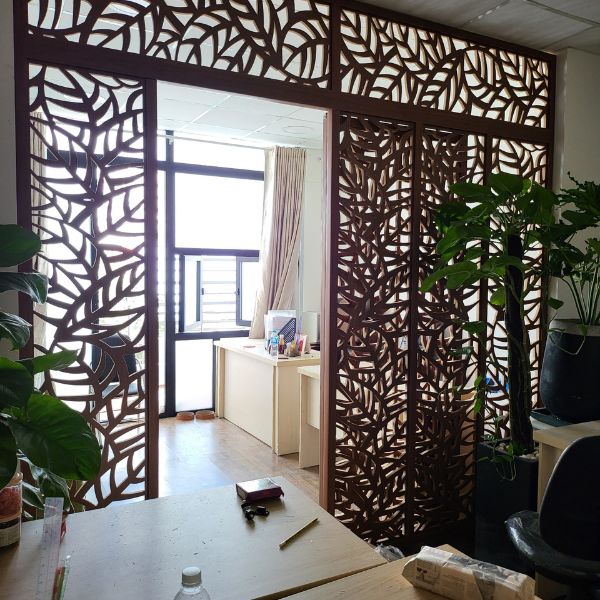 Điều làm nên sự khác biệt của vách cửa lùa CNC chính là hoa văn được cắt khắc tinh xảo. Mỗi họa tiết – từ chiếc lá, cành hoa đến hình khối hiện đại – đều phản chiếu gu thẩm mỹ của gia chủ. Khi ánh sáng xuyên qua, cả căn phòng như được khoác lên một “lớp áo mới”, vừa gần gũi thiên nhiên, vừa hiện đại.