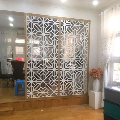 Mẫu này gồm 2 mặt cốt gỗ kết hợp vách hoa văn họa tiết 2 bên đem đến cho phòng khách của bạn sự mới lạ, độc đáo thích hợp với không gian nhà biệt thự, nhà có diện tích sử dụng lớn cần ngăn không gian một cách kín đáo để lắp điều hòa hoặc tạo điểm nhấn, tạo phong cách khác biệt. Điểm nhấn đến từ họa tiết CNC giúp cho vách ngăn vô cùng mềm mại, duyên dáng khiến phòng khách của bạn thật sự sang trọng và hiện đại.