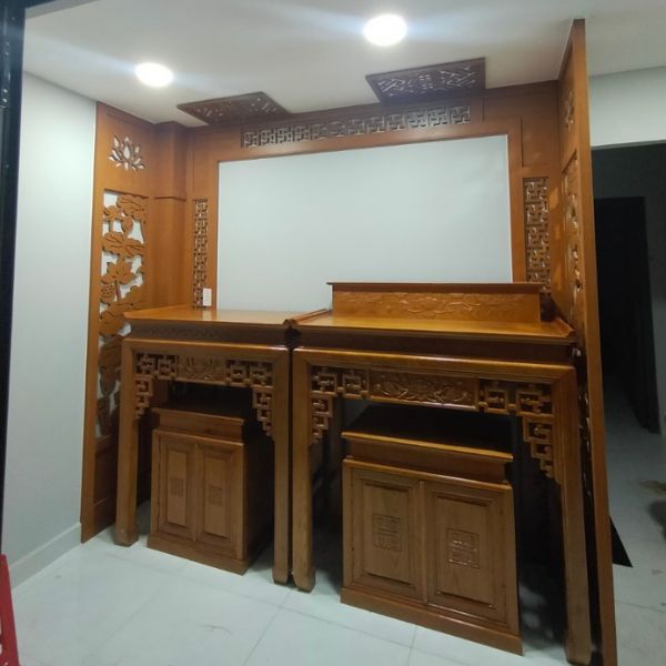 Vách ngăn được làm từ gỗ tự nhiên với những họa tiết phật giáo tinh xảo sẽ tạo nên một không gian phòng thờ linh thiêng và trang trọng.